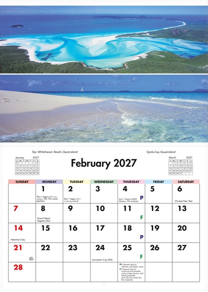 Compact panoramic calendar in standard size with unforgettable panoramas of Australia’s famously stunning beaches, with two images for each month.