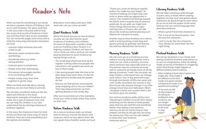 This heartwarming book touches on the themes of kindness and socio-emotional resonance, and the idea that our words matter. Follow a parent and child as they explore their neighborhood, listening for the sounds of kindness. Words of friendship, gratitude, support, generosity, and love...we can see and hear them if we try. What can you hear, if you take a kindness walk? Kindness is all around us everyday, if we know where to look--and listen!--for it. It's a gentle and encouraging acknowledgment that it is important in our families, friendships, and communities to listen and to be kind.