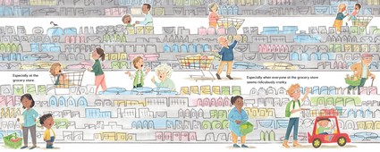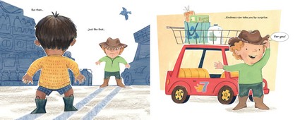 Sometimes being kind requires a little more oomph. Especially at the grocery store when everyone seems to be in a bad mood and the car cart you wanted is already taken. But sometimes kindness can take you by surprise. Suddenly the kid with the car cart yields his ride, and that small act changes everything. If crankiness is catching, kindness can be just as infectious. As one child shows kindness to others, he watches how his kindness spreads and grows, with one kindness leading to another throughout the store.