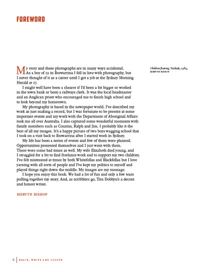 Tim Dobbyn is a former journalist who started at Australian Associated Press in 1981 before moving to the United States in 1987 to work for Reuters. After taking a break from daily journalism, he worked freelance jobs before starting work on the Mervyn Bishop biography in 2018. He and his family have known Bishop since 1962. He lives near Washington D.C. with his wife Sheila and two impossible dogs.